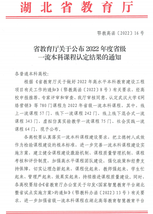近日,省教育厅公布了2022年度省级一流本科课程认定结果,我院2门课程《数值分析》《概率论与数理统计》入选。